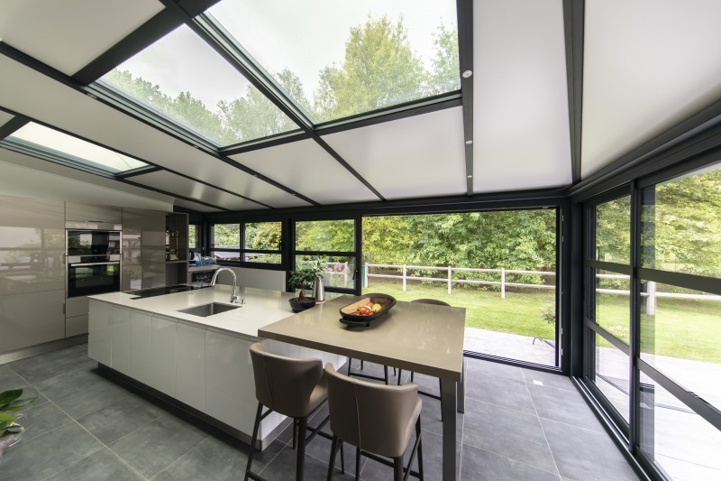 La véranda Cocoon est un concept à part entière qui intègre dans sa structure des volets roulants ou brise-soleil orientables électriques. Ses solutions domotiques vous permettent de contrôler l'apport de lumière naturelle dans votre véranda, tout comme dans votre maison. Les brise-soleil vous protégeront de la chaleur et de l'éblouissement; les volets roulants renforceront le confort thermique et constitueront un rempart contre d'éventuelles effractions.